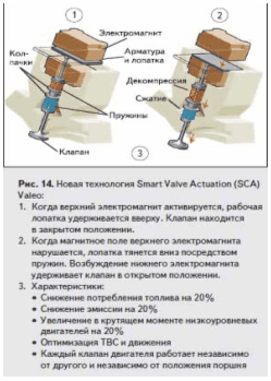 Датчик распределительного вала может стать ненужным и несколько раньше. Новейшая технология Valeo для уменьшения потребления топлива и снижения эмиссии на 20% (рис. 14) использует технологию Smart Valve Actuation (SVA) вместо обычной механической активации клапанов двигателя тросом распределителя, распределительным валом и гидравликой толкателей кулачка.