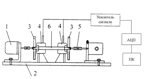 Экспериментальная установка для определения АЧХ и ФЧХ системы показана на рис 1. Она состоит из роторной системы, управляющей и измерительной аппаратуры. Исследуемая система представляет собой простейшую роторную систему. Конструктивно лабораторная установка состоит из основания, на котором крепятся две опоры, кронштейн датчика и асинхронный двигатель типа КД-50-У4, мощностью 60 Вт с номинальной частотой вращения 2750 об/мин. В опорах на подшипниках качения вращается вал с двумя дисками. Вал соединен с двигателем с помощью муфты. Датчики виброускорения помещаются на опоры в вертикальном и горизонтальном направлениях, ближе к дискам с дисбалансом.