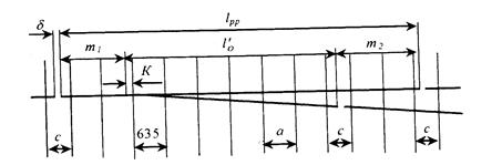 Длина переднего вылета рамного рельса принимается такой, чтобы под ним умещалось от одного до восьми целых пролетов а = (0,8 ÷ 0,9апер ), в зависимости от марки перевода.