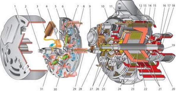 1 - кожух 2 - вывод "В+" для подключения потребителей 3 - помехоподавительный конденсатор 2,2 мкФ 4-общий вывод дополнительных диодов (присоединяется к выводу "D+" регулятора напряжения) 5 - держатель положительных диодов выпрямительного блока 6 - держатель отрицательных диодов выпрямительного блока 7- положительный диод 8- отрицательный диод 9 - регулятор напряжения 10 - задняя крышка 11 - стяжной винт 12 - передняя крышка 13 - обмотка статора 14 - дистанционное кольцо 15 - передний подшипник вала ротора 16 – шкив 17 - гайка 18 - вал ротора 19 - конусная шайба 20 - шайба 21 - клювообразные полюсные наконечники ротора 22 - сердечник статора 23 - втулка 24 - обмотка ротора 25 - задний подшипник ротора 26 - втулка подшипника 27 - контактные кольца 28 - щеткодержатель 29 - выводы обмотки статора 30 - дополнительный диод 31 - вывод "D" (общий вывод дополнительных диодов)