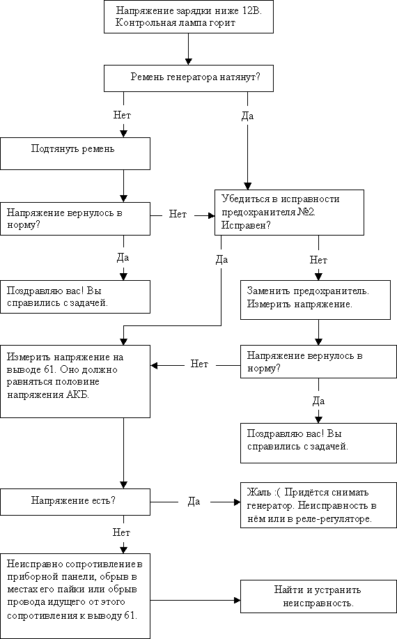 Вспыхнувшая контрольная лампа зарядки АКБ не всегда говорит о неисправности внутри генератора. Зачастую неисправность банальна и лежит на поверхности. Поэтому не стоит сразу же лезть в генератор и сломя голову менять реле-регулятор, авось поможет. Посмотрите схему предварительной диагностики. Для её проведения, возможно, потребуется вольтметр со шкалой не менее 15 В. Каждый может сделать эти проверки и, тем самым, уберечь себя от лишних, неверных действий и потери драгоценного времени.