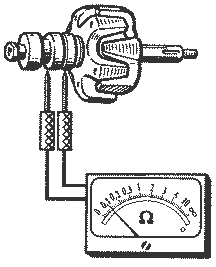 Разрыв чаще всего происходит в месте пайки выводов обмотки к кольцам. Следует внимательно проверить качество этой пайки. Проверку можно осуществить иглой, шевеля выводы обмотки в месте их подпайки. О сгорании обмотки свидетельствует потемнение и осыпание ее изоляции, что можно обнаружить визуально. Сгорание обмоток приводит к обрыву или к межвитковому замыканию в обмотке с уменьшением ее общего сопротивления. Частичное межвитковое замыкание, при котором сопротивление обмотки меняется мало, может быть выявлено прибором ПДО-1, сравнением данной обмотки с заведомо исправной. После проверки сопротивления обмотки следует проверить отсутствие у нее замыкания на "массу". Для этого один вывод омметра подносится к любому кольцу ротора, а другой к его клюву. У исправной обмотки омметр покажет бесконечно большое сопротивление. Неисправный ротор подлежит замене.