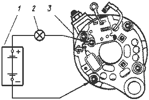 Сначала проверьте, нет ли замыкания одновременно в "положительных" и "отрицательных" вентилях. Для этого "плюс" батареи через лампу подсоедините к зажиму "30" генератора, а "минус" к корпусу генератора: