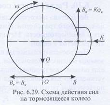Тормозной момент Мт при вращении колеса уравновешивается моментом Вг • R, где Вт — сила реакции, возникающая в точке О касания колеса с рельсом. Точка О нагружена силой Q, то есть частью веса экипажа, приходящейся на колесо с учетом веса самого колеса. Из равенства моментов сил Вк и Вт следует, что сила Вт является тормозной силой экипажа, приложенной в точке О, которая является непрерывно перемещающимся упором для силы Вк при вращении колеса.