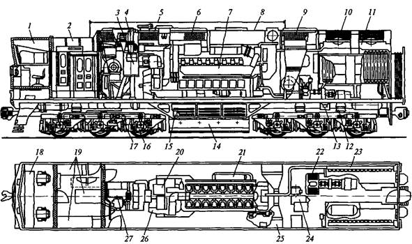 1 — кабина машиниста; 2 — кузов над высоковольтной камерой; 3 — выпрямительная установка; 4 — вентилятор выпрямительной установки; 5 — антенна; 6, 9 — воздушные фильтры; 7— дизель; 8 — кузов над дизелем; 10— вентилятор холодильника; 11 — шахта холодильника; 12 — опора кузова; 13 — шкворень; 14 — топливный бак; 15 — аккумуляторная батарея; 16 — букса; 17 — тележка; 18 — пульт управления; 19— высоковольтная камера; 20— вентилятор генератора; 21 — водомасляный теплообменник; 22— компрессор; 23 — секции радиатора; 24, 27 — вентиляторы тяговых электродвигателей; 25 — воздухоочиститель дизеля; 26 — тяговый генератор