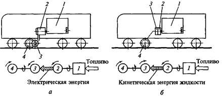 а — электрической: 1 — дизель; 2 — тяговый генератор; 3 — тяговый электродвигатель; 4 — колесно-моторный блок; б — гидравлической: / — дизель; 2 — насосное колесо; 3 — турбинное колесо гидротрансформатора; 4 — колесно-редукторный блок турбины жидкость вращает ее, а вместе с ней через карданные валы и осевые редукторы — колесные пары тепловоза.