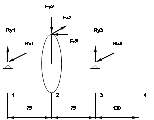 где l = 260 мм - расстояние между опорами червяка; Fx=273,788H, Fy=907,518H - силы, действующие на червяк; E=2,1 x 105 Нxмм2.