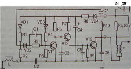 Сигнал с обмотки L магнитоэлектрического датчика через диод VD2, пропускающий только положительную полуволну напряжения, и резисторы R2, R3 поступает на базу транзистора VT1. Транзистор открывается, шунтирует переход база-эмиттер транзистора VT2, который закрывается. Закрывается и транзистор VT3, ток в первичной обмотке катушки зажигания прерывается, и на выходе вторичной обмотки возникает высокое напряжение. В отрицательную полуволну напряжения транзистор VT1 закрыт, открыты VT2 и VT3, и ток начинает протекать через первичную обмотку катушки возбуждения. Очевидно, что число пар полюсов датчика должно соответствовать числу цилиндров двигателя.