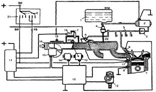 1 — топливный бак, 2 — топливный насос, 3 — фильтр тонкой очистки топлива, 4 — регулятор давления топлива в системе, 5 — распределительная магистраль, 6 — пусковая форсунка, 7 — блок цилиндров двигателя, 8 — форсунка (инжектор) впрыска, 9 — датчик температуры охлаждающей жидкости, 10 — электронный блок управления, 11 — блок реле, 12 — датчик-распределитель зажигания, 13 — выключатель положения дроссельной заслонки, 14 — высотный корректор, 15 — расходомер воздуха, 16 — подвод воздуха, 17 — термореле, 18 — винт качества (состава) смеси на холостом ходу, 19 — клапан добавочного воздуха, 20 — винт количества смеси на холостом ходу, 21 — выключатель зажигания, 22 — подвод разрежения к регулятору давления топлива в системе