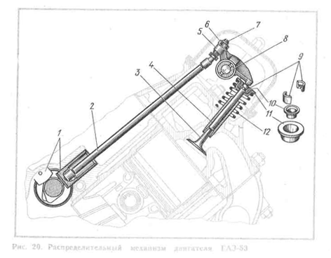 Современные двигатели имеют верхние клапаны. Верхнее расположение клапанов показано на примере устройства распределительного механизма двигателя ГАЗ-53 (рис. 20). Распределительный вал через кулачок и толкатель /действует не непосредственно на клапан, а через систему, состоящую из штанги 2, регулировочного винта 7 с гайкой 6, коромысла 5 с осью 8. Эти детали своей массой увеличивают силы инерции частей, движущихся возвратно-поступательно, поэтому ставят усиленные клапанные пружины 12.