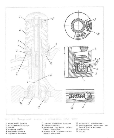 Таким образом возвратная пружина поворачивает дисковую, а вместе с ней опорную шайбу клапанной пружины, саму клапанную пружину и клапан. Во время закрытия клапана давление клапанной и дисковой пружин уменьшается и возвратная пружина перемещает шарик в исходное положение Клапаны с поворотом применяются и в двигателях ЯМЗ-236 и ЯМЗ-238. Поворотное приспособление повышает работоспособностьклапана.