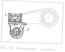 Толкатель двигателей ЯМЗ-236 и ЯМЗ-238 выполнен качающимся и имеет ролик 2, который обкатывается по кулачку (рис. 22). Роликовый толкатель уменьшает трение и износ толкателя и кулачка.