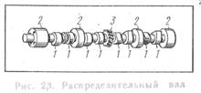 Наиболее сложной деталью механизма распределения является распределительный вал, обеспечивающий необходимое управление клапанами. Он состоит из кулачков / (по два на цилиндр) и опор 2 (рис. 23). Дополнительно вал имеет шестерню 3 с винтовыми зубьями для привода масляного насоса и распределителя системы зажигания. Перечисленные детали выполняются с валом за одно целое. Профили кулачков обеспечивают плавное движение клапана и необходимую продолжительность его открытия. Угол между одноименными кулачками для четырехцилиндрового четырехтактного двигателя равен 1,57 рад (90°), для шестицилиндрового — 1,05 рад (60°) и восьмицилиндрового — 0,8 рад (45°.)