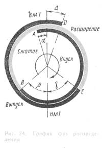 Наглядное изображение фаз распределения получается в системе круговой диаграммы, где по углу поворота кривошипа размечены такты работы двигателя (рис. 24). Выпуск начинается в А с опережением а=0,16- 0,42 рад (9—24°) и заканчивается в β с опозданием β = =0,8-1,2 рад (46-70°). От β до С идет сжатие и расширение, в С начинается выпуск с опережением J = 0,86-1,16 рад (50-67°) и заканчивается в Dс запаздыванием Δ=0,17-0,52 рад (10-30°). Таким образом, продолжительность впуска равна