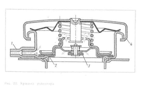 Для изоляции системы охлаждения от окружающей атмосферы верхний бачок радиатора имеет специальную крышку (пробку) (см. рис. 26). К крышке радиатора (рис. 27) подходит трубка 1; в ней имеется два клапана: паровой 2, находящийся под воздействием большой пружины, и воздушный 3, управляемый маленькой пружиной. Клапаны смонтированы в колпаке 4, прижимаемом к горловине круглой гофрированной пружиной.