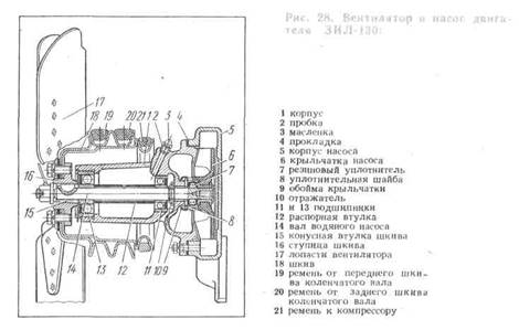 Вентилятор 2 (см. рис. 25) обеспечивает интенсивное протекание воздуха через охлаждающую часть радиатора, что создает необходимое понижение температуры воды в радиаторе. Устройство вентилятора (автомобиль ЗИЛ-130) показано на рис. 28: лопасти 17 крепятся к ступице 16 шкива 18, несущего приводные ремни 19, 20, 21; ступица сидит на валу 14, опирающемся на подшипники 13 и 11, которые расположены в корпусе . Количество лопастей бывает четыре или шесть; для сокращения вибрации и шума лопасти располагают попарно под разными углами.