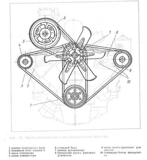 Для привода вспомогательных агрегатов двигателя, в том числе вентилятора и водяного насоса, служат ременные передачи (рис. 29). Эти приводы обычно объединяются с приводами других агрегатов, действующих от двигателя. Так, в комплекте приводов двигателя автомобиля ЗИЛ-130 (рис. 29) от переднего шкива коленчатого вала, идут два привода: один (левый) на генератор (шкив 4) и вентилятор (передний шкив 7 на рис. 29 и ремень 19 на рис. 28) и другой (правый) от заднего шкива коленчатого вала к насосу рулевого усилителя (шкив 9) и вентилятору (ремень шкива 20, рис. 28); от вентилятора передача идет на шкив 5 компрессора (ремень 21 на рис. 28). При таком сочетании ремней регулировка натяжения для вентилятора производится одновременно с регулировкой натяжения для генератора и насоса рулевого усилителя.