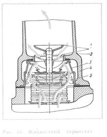В жидкостном термостате (см. рис. 31) с двумя клапанами на пустотелом стержне имеется верхний клапан патрубка 2, идущего к радиатору, нижний клапан 3 патрубка 4, идущего к насосу, и сильфонный баллон 5, заполненный легко кипящей жидкостью (эфир или смесь из V3 этилового спирта и 2/3 дистиллированной воды). При непрогретом двигателе сильфонный баллон сжат, верхний клапан закрыт, а нижний открыт (пунктир на схеме), и вода насосом перегоняется в рубашки цилиндров и из них на выход к термостату (малый круг циркуляции). Циркуляция по «малому кругу» ускоряет прогрев холодного двигателя. При нагреве воды сильфон расширяется и поднимается вверх, при этом верхний клапан открывается, а нижний закрывается, и вода направляется по патрубку к радиатору, из него — в насос, рубашки цилиндров, а из них — на выход к термостату (стрелки на схеме, большой круг циркуляции). Температура воды в начале расширения баллона у разных двигателей различна (60 - 75° С), клапаны термостата открываются полностью при 80 - 90° С.