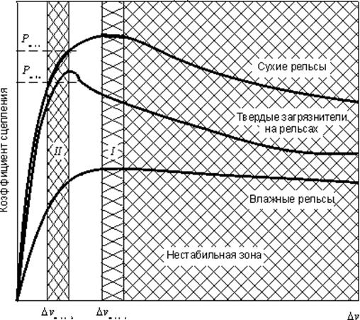 Целью регулирования сцепления является как можно более высокое использование сил сцепления при минимальном проскальзывании колеса относительно рельса. На первый взгляд напрашивается вывод об использовании с этой целью участка с максимальным коэффициентом сцепления (зона I на рис. 2). Предположим, что такой режим задан системе логики слежения. В этом случае при стохастических изменениях состояния рельсов коэффициент сцепления может кратковременно снижаться, попадая на неустойчивый участок характеристики. За то время, пока система регулирования вновь вернется к рабочей точке с максимальным коэффициентом сцепления, в тяговом тракте может возникнуть опасный эффект самовозбуждения, который приведет к режиму движения с прерывистым сцеплением между колесом и рельсом.