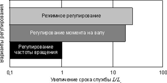 За исходный принят срок службы (L0) системы с обычным регулированием частоты вращения. Как видно из диаграммы, наилучшие результаты получены при режимном регулировании.