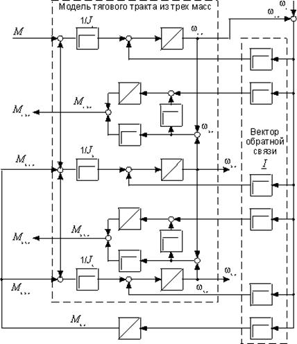 | Рис. 5. Структура следящего устройства непрерывного типа для колебательной системы из трех масс: М - электромагнитный момент в зазоре; M12r - расчетное значение момента на полом валу; ML1r - расчетное значение нагрузочного момента на первом колесе моторной оси; M23r - расчетное значение момента на оси колесной пары; ML2r - расчетный нагрузочный момент на втором колесе; MLr - общий расчетный нагрузочный момент; 1r - 3r - расчетные значения угловой скорости трех масс системы |