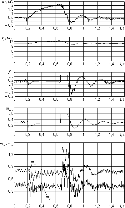 | Рис. 7. Действие обычной изодромной системы регулирования при изменении условий сцепления: vu - окружная скорость колеса; fx - коэффициент сцепления в продольном направлении; msoll - приведенный задаваемый момент, используемый при формировании модели силы сцепления; m12, m23 - приведенные моменты полого вала и оси колесной пары |