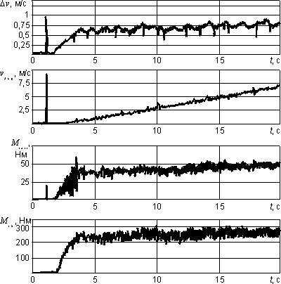 На рис. 7 показана работа стенда с обычным изодромным регулятором без активного гашения колебаний. В тяговом режиме при скорости поезда 10 м/с и 90 % задаваемого значения вращающего момента в момент времени t = 0,2 c коэффициент сцепления скачкообразно падает со 100 до 60 %.