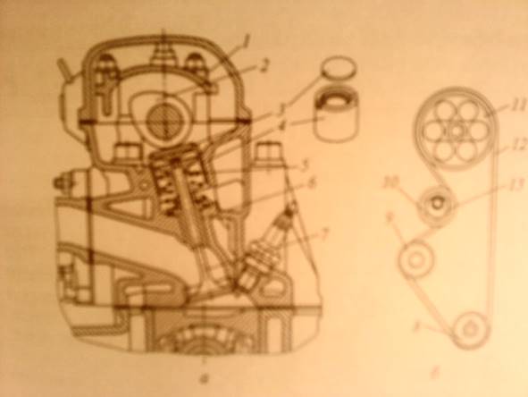 1 – корпус, 2 – распределительный вал, 3 – шайба, 4 – толкатель, 5 – пружина, 6 – втулка, 7 – клапан, 8,9,11 – шкивы, 10 – ролик, 12 – ремень, 13 – ось.