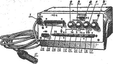 1 — роз'їм "вхід" для підключення первинного перетворювача; 2, 3, 4 — ручки потенціометрів установки калібрувальних значень прискорення "N", рівня фіксації "nN" і частоти обертання "n"; 5 — тумблер "живлення"; 6 — ручка "вкл." для включення приладу і регулювання временя індикації результатів вимірювання на цифровому табло; 7...14 – клавіші перемикання виду робіт; 15 – цифрове табло; 16 – роз'їм "живлення" 12 В для підключення зовнішнього джерела живлення; 17 – первинний перетворювач.