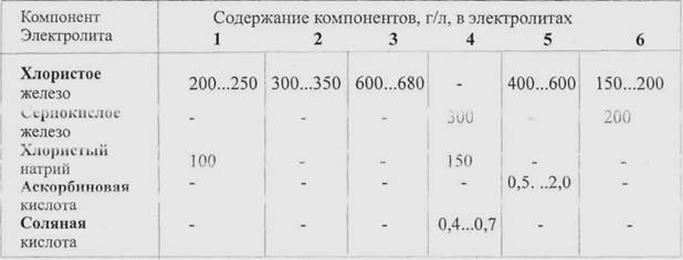 Электролит 4 в ремонтной практике не применяют. Наличие в эктролите 5 аскорбиновой кислоты предотвращает его окисление и образование гидроокиси железа, в результате чего возможно получение высококачественных покрытий при низкой температуре и достаточно высокой плотности тока.