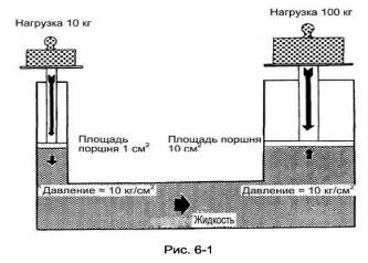 "Давление на поверхности жидкости, вызванное внешними силами, передается жидкостью одинаково во всех направлениях". В правом цилиндре (рис. 6-1) создается давление пропорциональное площади поршня и приложенному усилию. Если к поршню приложено усилие 100 кг, а его площадь -10 см2 , то созданное давление будет равно 100 кг/10 см2 =10 кг/см2 . Вне зависимости от формы и размеров системы давление жидкости распределяется равномерно. Другими словами, давление жидкости одинаково во всех точках.