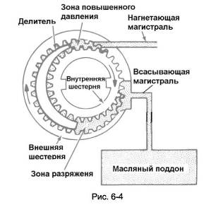 Внутренний ротор, являющаяся ведущим элементом, с помощью кулачков вращает внешний ротор. Насосная камера формируется между кулачками и впадинами роторов. При вращении кулачки выходят из впадин, и камера увеличивается, создавая при этом зону разряжения. В дальнейшем кулачки внешнего и внутреннего роторов вновь входят в контакт, постепенно уменьшая объём камеры. В результате чего жидкость вытесняется в напорную магистраль (рис.6-5).