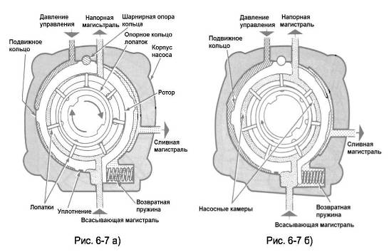 В автоматических коробках передач используются усовершенствованные версии лопастных насосов, обеспечивающие переменную производительностью при постоянной частоте вращения двигателя. В отличие от лопастного насоса постоянной производительности здесь в корпус насоса установлено подвижное кольцо, внутри которого и размещается ротор с лопатками (рис.6-7).
