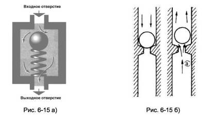 Эти клапаны управляют потоком жидкости в одной магистрали (рис.6-15). Одноходовой клапан очень похож на предохранительный клапан, за исключением того, что при открытии клапана ATF попадает не в поддон, а в какую-то магистраль. Пока, давление не достигнет определенной величины, пружина подпирает шарик и не позволяет, таким образом, жидкости перемещаться по магистрали, где установлен этот клапан. При определенном давлении, которое также определяется жёсткостью пружины, клапан открывается и ATF попадает в магистраль (рис.6-15а). Движение жидкости через клапан будет происходить до тех пор, пока давление не станет меньше заданной пружиной величины. Движение жидкости в обратном направлении через одноходовой клапан невозможно.