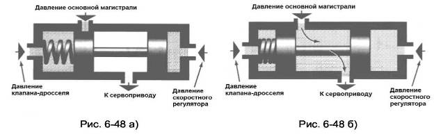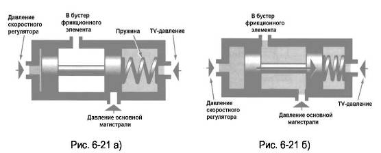 В чисто гидравлических системах управления моменты переключения определяются соотношением TV-давления и давления скоростного регулятора. Поэтому к одному торцу клапана подводится давление клапана-дросселя, а к другому давление скоростного регулятора (рис.6-20). В зависимости от соотношения этих давлений клапан может занимать крайнее нижнее положение (передача выключена) или крайнее верхнее положение (передача включена). С помощью пружины, действующей на торец клапана со стороны подвода TV-давления, можно осуществлять корректировку моментов включения и выключения передачи. Кроме того, пружина при отсутствии в гидросистеме давления удерживает клапан переключения в положении, соответствующему выключению передачи.