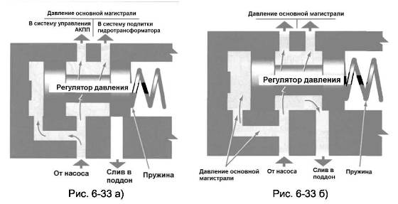 Управление производительностью лопастного насоса осуществляет регулятор давления (рис.6-8), который в процессе движения автомобиля соответствующим образом формирует управляющее давление, корректируя при этом производительность насоса.
