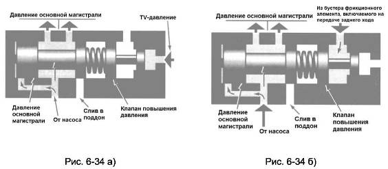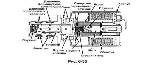 принудительного понижения передачи (рис.6-53). При наличии сигнала управления соленоид открывает дополнительный канал подвода максимального TV-давления к клапану переключения.
