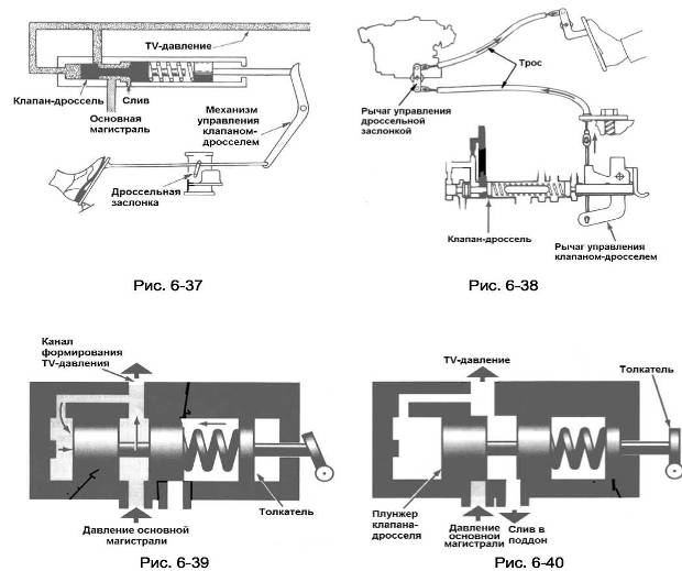 Для получения давления, зависящего от загруженности двигателя, используется клапан-дроссель, который, чаще всего располагается в клапанной коробке. Управление этим клапаном на различных моделях АКПП осуществляется двумя различными способами. В соответствии с первым способом используется механическая связь между дроссельной заслонкой двигателя и клапаном-дросселем. В качестве механической связи может использовать либо трос, либо система тяг и рычагов. Во втором способе для управления клапаном-дросселем используется вакуумный модулятор. Модулятор с помощью трубки соединен с задроссельным пространством впускного коллектора двигателя. Степень разряжения во впускном коллекторе и является задающим параметром для получения давления, пропорционального степени загруженности двигателя. Чем выше загрузка двигателя, тем выше давление, которое формирует клапан-дроссель. Часто давление клапана-дросселя называю TV-давлением, что происходит от английского словосочетания «ThrottleValvepressure».