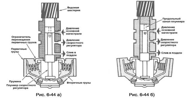 В случае движения с небольшой скоростью центробежная сила, действующая на вторичный (легкий) груз мала, и пружина не позволяет прижать его к седлу отверстия. В это время регулировка давления скоростного регулятора осуществляется только за счет первичного (более тяжелого) груза, который прижимает свой шарик к седлу с силой пропорциональной квадрату скорости движения автомобиля. При определенной скорости движения первичный груз полностью прижимает шарик к седлу отверстия, и утечки ATF через него уже не происходит. При этом центробежная сила, возникающая во вторичном грузе, достигает величины, способной преодолеть силу сопротивления пружины, и специальный захват этого груза начинает прижимать второй шарик к седлуотверстия вала. Теперь одно из двух отверстий вала полностью закрыто, и формирование давления скоростного регулятора осуществляется только за счет второго шарика. При высокой скорости движения автомобиля вторичный груз также полностью прижимает свой шарик к седлу отверстия, и давление скоростного регулятора становится равным давлению основной магистрали.