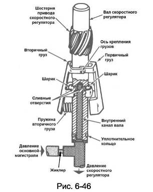 Скоростной регулятор шарикового типа состоит из полого вала, который приводится во вращение с помощью зубчатого зацепления ведомым валом АКПП, двух шариков, установленных в отверстиях вала, одной пружины и двух грузов различной массы, шарнирно закрепленных на валу (рис.6-46). К валу через жиклёр подводится давление основной магистрали, из которого во внутреннем канале вала формируется давление скоростного регулятора. Величина давления скоростного регулятора определяется величиной утечек через отверстия, в которых установлены шарики. Каждый из двух грузов имеет специальной формы захваты, с помощью которых они удерживают противоположно расположенный им шарики (рис.6-46).