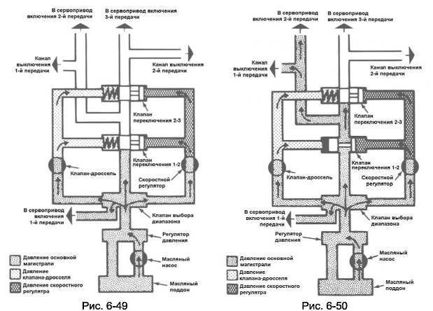 Давление клапана-дросселя и скоростного регулятора подводится к клапанам переключения передач. Соотношение этих давлений, действующих на торцы клапанов переключения, и определяет моменты переключения передач в АКПП с чисто гидравлической системой управления.