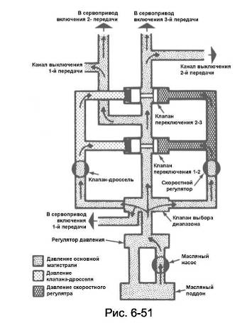 Клапан переключения 1-2 перемещается, соединяя при этом основную магистраль с каналом подвода давления в сервопривод включения второй передачи (рис.6-50). Помимо этого давление основной магистрали подводится к клапану переключения 2-3, готовя его тем самым к следующему переключению. Кроме того, давление основной магистрали подается в канал подвода давления к клапану, ответственному за выключение первой передачи, что необходимо делать для предотвращения одновременного включения двух передач.