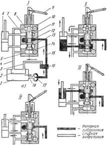 При положенні 1 паски золотника 11 перекривають доступ робочої рідини з порожнини 12 у порожнині 13 і 7, а також злив з них через порожнини 8 і 5. У цьому випадку робоча рідина, що знаходиться в гідроциліндрі, замкнений і керований елемент робочого устаткування нерухоме (нейтральне положення ІІ). Робоча рідина, надходячи від насоса 17 до гідророзподільника 14, підвищує тиск у напірній гідролінії 15 і, переборовши опір пружини переливного клапана 16, убудованого в гідророзподільник, зливається в гідробак 1.