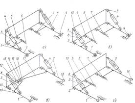 а — ДЗ-101 і ДЗ-101А; б -ДЗ-110; в — ДЗ-110А и ДЗ-118 (в останньої моделі гідроциліндр перекосу розташований праворуч); г — ДЗ -35Б; 1 — штовхаючий брус; 2 - пальцевий шарнір; 3 - відвал; 4- гвинтовий розкіс; 5 - пальцеве з'єднання; 6 - гвинт; 7 - завзята шайба; 8- гідроциліндр перекосу; 9 - кульова опора зі сферичною втулкою; 10 — сферичний шарнір або шарнір зі сферичною втулкою; 11— шарнір із двома взаємно перпендикулярними пальцями; 12 — напрямна скоба на відвалі; 13 — опорна шайба; 14 — гвинт із голівкою; 15 — кронштейн бруса із втулкою; 16 — палець; 17 — растяжка; 18 — кульова опора