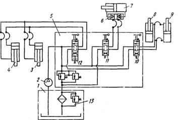 1 - гідробак, 2 - насос, 3, 4, 8, 9 - гідроциліндри, 5 - гідророзподільник, 6 -гідрозамок, 7 - гідророзкіс, 10 - 12 - секції гідророзподільника, 13 - фільтр