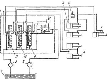1 - гідробак, 2 - фільтр, 3 - насос, 4 - гідророзподільник, 5,7,8- гідроциліндри, 6 - гідроклапан, 9 - 11 – золотники.