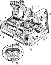 Рис. 6. Шестерінчастий насос (а) і схема роботи (б)