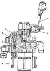 1 - болт, 2 - втулка, 3 - корпус, 4, 5 - шестірні, б - прокладка, 7 - кришка, 8 - манжета, 9 - кільце, 10 - переливний канал
