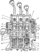 На базових гусеничних і колісних тракторах встановлюють однотипні трьохзолотникові чотирьохпозиційні гідророзподільники (Рис. 7.) з убудованими пропускним і запобіжним гідроклапанами. Це так названий гідророзподільник з "закритим центром", у якого напірна гідролінія (порожнина Д) у нейтральному положенні золотників є тупиковою і рідина зливається через переливний гідроклапан 9.