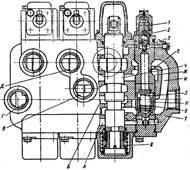 У гідросистемі робочого устаткування самохідного скрепера ДЗ-11П установлений трьохсекційний трьохпозиційний гідророзподільник з убудованим запобіжним гідроклапаном (Рис. 8). Основна відмінність цього гідророзподільника від розглянутого вище - "відкритий центр", при якому напірна порожнина з'єднується зі зливальною усередині гідророзподільника прямо.